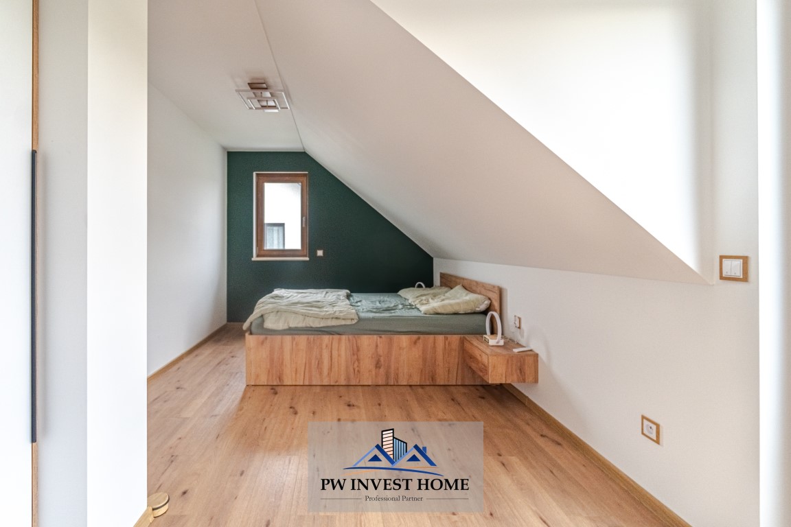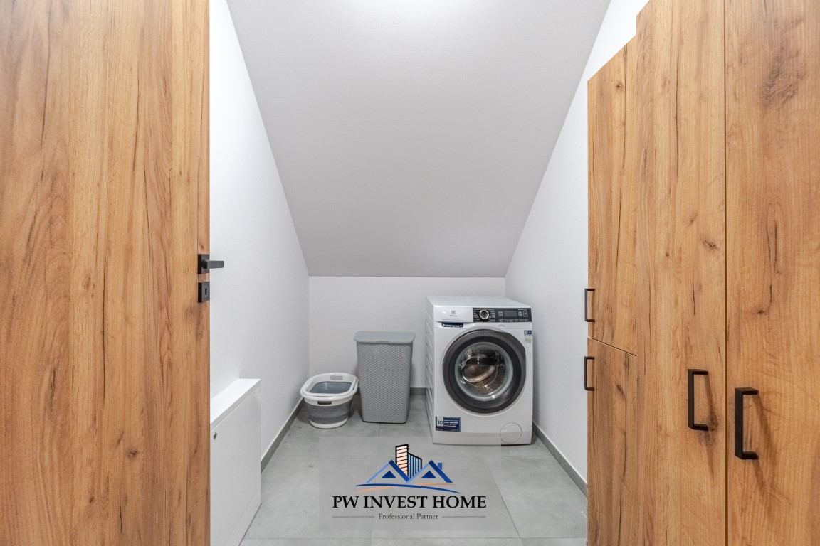Na parterze znajdują się salon z kuchnią, łazienka z WC, wiatrołap, pokój oraz kotłownia. Piętro obejmuje trzy pokoje, łazienkę z WC oraz garderobę z funkcją pralni. Taki rozkład zapewnia wyraźny podział na strefę dzienną i prywatną, a jednocześnie daje szerokie możliwości aranżacyjne. Dodatkowym atutem jest fakt, że wszystkie meble pozostają w nieruchomości, co może znacząco ułatwić przyszłemu właścicielowi przeprowadzkę i szybkie rozpoczęcie użytkowania domu.
