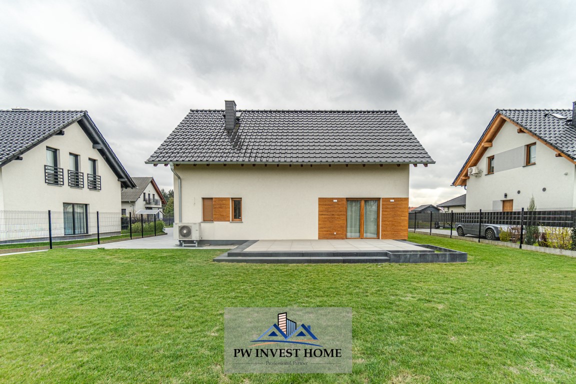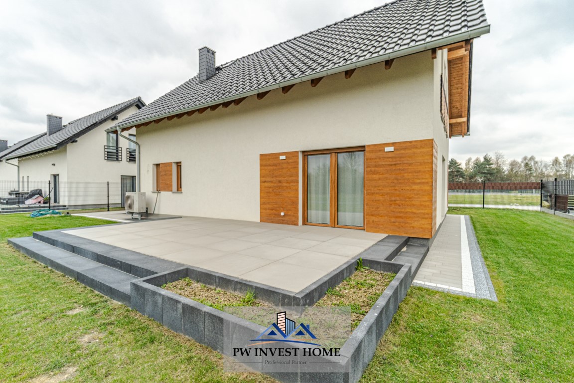 Budynek został zbudowany z bloczków ceramicznych i posadowiony na ławach fundamentowych. Dom ogrzewany jest pompą ciepła o mocy 9 kW, która odpowiada również za podgrzewanie wody użytkowej w zbiorniku o pojemności około 200 litrów. W budynku zastosowano wentylację grawitacyjną, bez rekuperacji. Dach pokryty jest dachówką ceramiczną i ocieplony wełną o grubości 25 cm, natomiast ściany zewnętrzne zostały ocieplone styropianem o grubości 15 cm. Nieruchomość wyposażona jest w okna PCV trzyszybowe oraz elektryczne rolety zewnętrzne, co wpływa na wysoki komfort użytkowania oraz dobrą izolację termiczną. Poddasze pozostaje nieużytkowe, a dodatkowo przygotowano wyjście pod instalację fotowoltaiczną.